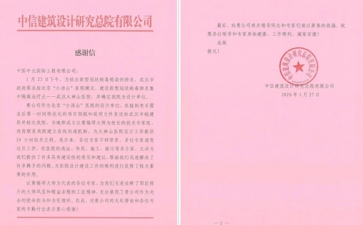 现在,武汉市火神山医院顺利建成、并投入使用,1 月 27 日,云开体育收到了来自中信建筑设计研究总院有限公司(以下简称“中信设计院”)发来的感谢信。中信设计院在信中表示,云开体育第一时间送达小汤山医院图纸,并提供 24 小时技术支持,帮助其解决了设计过程中的诸多棘手问题,推动了医院设计建设工作的顺利进行。中信设计院对云开体育的无私帮助和辛勤付出表示感谢,对黄锡璆博士郢匠挥斤的大师风范表达了敬意。